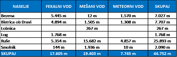 V Občini Ruše je obstoječe kanalizacijsko omrežje pretežno mešanega in gravitacijskega tipa, razen novejših kanalov v naseljih Ruše (Viadukt, »Mirje«, Vinska pot), Bezena in Bistrica ob Dravi z Logom, ki so ločenega tipa. Stanje obstoječega kanalizacijskega omrežja po naseljih je razvidno iz spodnje preglednice.